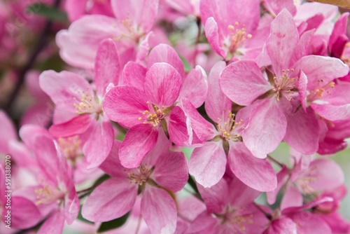 Fototapeta premium A branch of apple tree with pink flowers. Flowering apple tree in spring. Blossoming apple with soft focus.