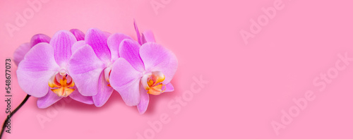 Fototapeta premium A branch of purple orchids lies on a pink background