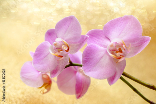 © licvin, Obraz premium A branch of purple orchids on a shiny gold background.