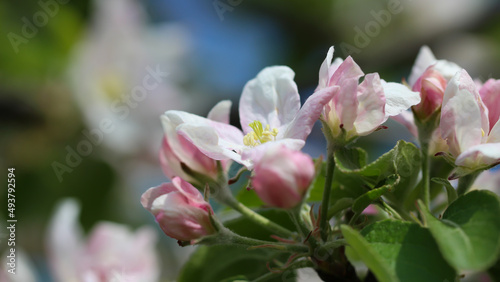 Fototapeta premium A branch of white apple blossoms with selective focus on a blurry background....