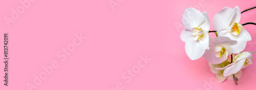 © licvin, Naklejka premium A branch of white orchids lies on a pink background