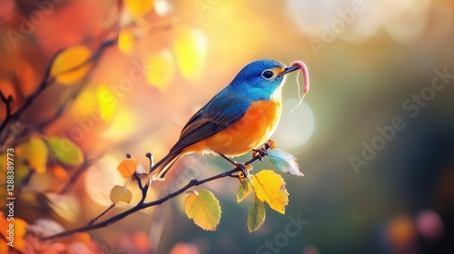 © Nicoum, Fototapeta premium a branch with a worm in its beak, the surrounding soft-focus leaves and light creating a perfect 4K nature shot.