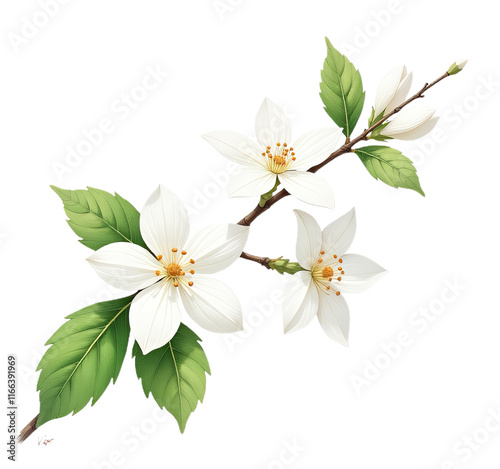 © Pisit, Obraz premium A branch with white jasmine flowers and green leaves , against a white background
