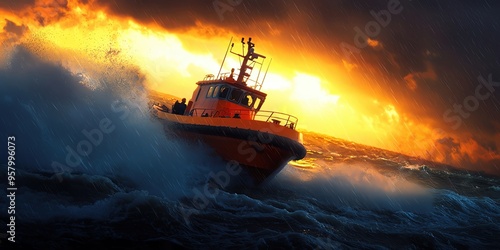 © narak0rn, Naklejka premium A brave boat navigates through turbulent waves under a dramatic sunset, showcasing the power of nature and maritime resilience.