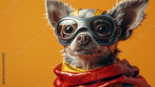 © Papatsorn, Fototapeta premium A brave Chihuahua dog dons flying goggles and a scarf, ready for a whimsical adventure, with a bold orange backdrop.
