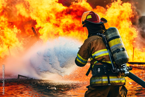 © sergign, Fototapeta premium A brave firefighter dressed in full gear fights a fierce blaze with a hose, showcasing courage and preparation in the face of daunting danger.
