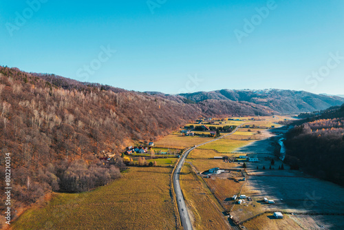 Fototapeta premium A breathtaking aerial view captures a tranquil rural landscape with a...