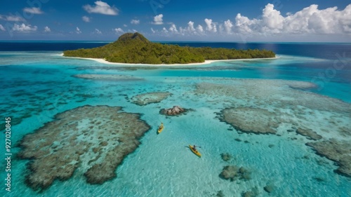 © arpln, Obraz premium A breathtaking aerial view of a tropical island with clear turquoise waters and a lone adventurer kayaking, capturing the essence of travel and exploration.