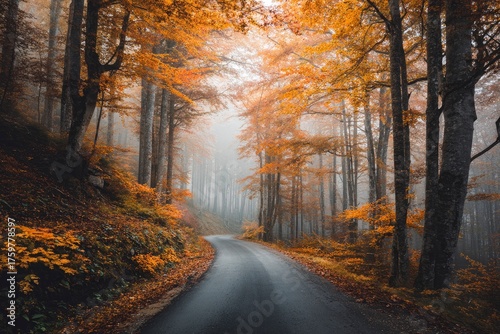 © Sulaihatin, Obraz premium A breathtaking autumn landscape features a winding asphalt road meandering through a misty, vibrant forest. Tall, majestic deciduous trees with brilliant orange and golden foliage create a natural arc