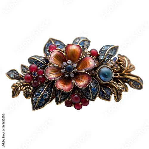 Fototapeta premium A breathtaking autumnal floral brooch, adorned with rich enamel flowers, sparkling sapphires, and ruby accents, set against a pristine white background.