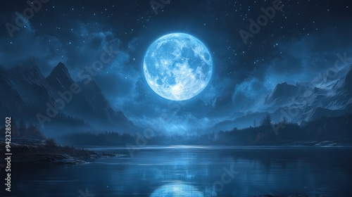 Fototapeta premium A breathtaking blue moon rising over a serene landscape, with its cool,...