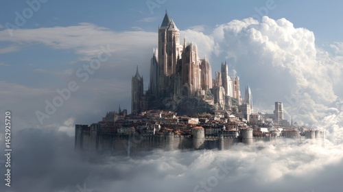 Fototapeta premium A breathtaking castle rises above the clouds, showcasing an epic and fantastical medieval kingdom.