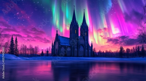 © Bold24, Fototapeta premium A breathtaking Catholic church set against a vibrant aurora borealis sky.