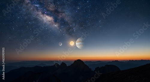© Gustav, Fototapeta premium A breathtaking celestial display features Venus, a crescent Moon, and Jupiter aligned over a dramatic mountain range under the starry Milky Way.