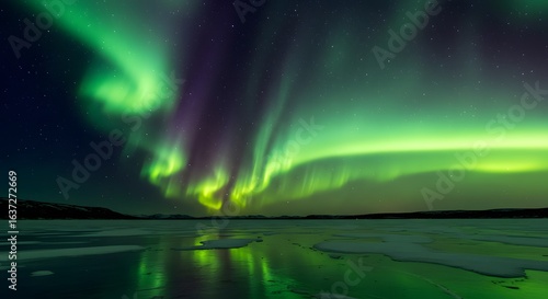© Adi, Naklejka premium A breathtaking celestial display of the aurora borealis with vibrant green and purple lights dancing over a frozen arctic lake.