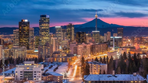 © Rony, Obraz premium A breathtaking city skyline at dusk, illuminated by vibrant lights
