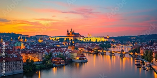 © Soklin, Fototapeta premium A breathtaking cityscape at dusk, with the sky painted in hues of orange and pink