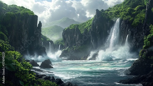 Fototapeta premium A breathtaking coastal landscape featuring towering jagged cliffs that frame a tranquil lagoon. Lush greenery cascades down the cliffs, merging seamlessly with the azure waves of the ocean. Several wa