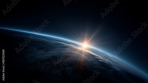 Fototapeta premium A breathtaking cosmic sunrise as seen from orbit, with the edge of Earth glowing in vivid blue tones. The sun’s bright core emerges from behind the horizon, casting powerful rays t