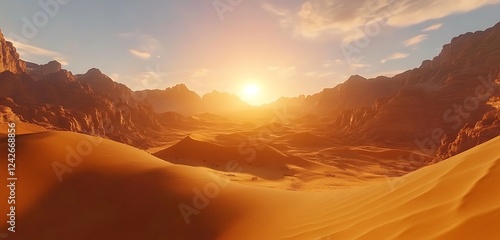 Naklejka premium A breathtaking desert scene with rolling dunes and the sun setting in the...
