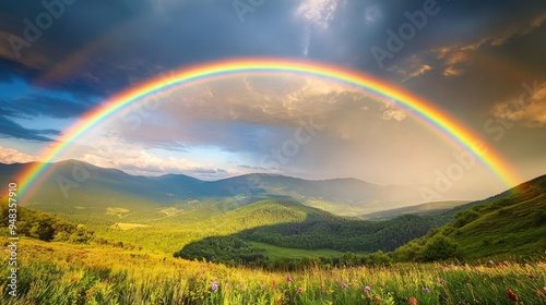Naklejka premium A breathtaking double rainbow arching over a lush green valley, with vibrant...