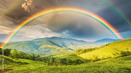 Naklejka premium A breathtaking double rainbow arching over a lush green valley, with vibrant colors against a cloudy sky after a summer rain.