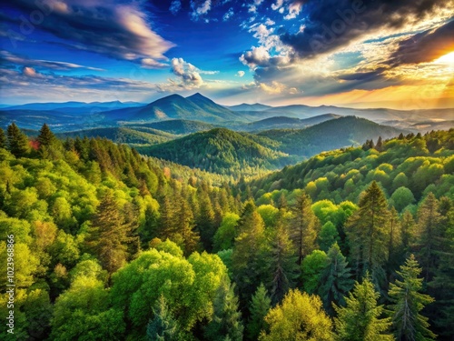 Fototapeta premium A breathtaking forest panorama showcases vibrant greenery and distant...