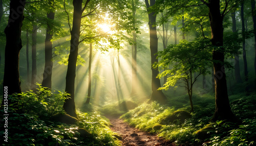 © Evi, Obraz premium A breathtaking garden filled with vibrant, colorful flowers in full bloom, surrounded by lush greenery and towering trees. A winding stone path leads through the garden, with butterflies fluttering an