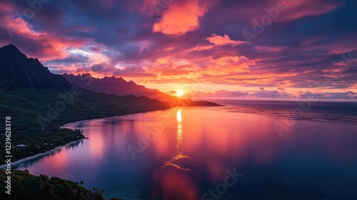 © Natchooda, Fototapeta premium A breathtaking high-angle view captures the vibrant sunset colors reflecting over the South Pacific Ocean, casting a warm glow over the lagoon of Moorea.