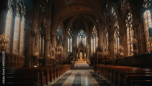 © Being Imaginative, Fototapeta premium a breathtaking image of a majestic cathedral with towering spires, intricate stained glass windows, and ornate architectural details - AI Generative