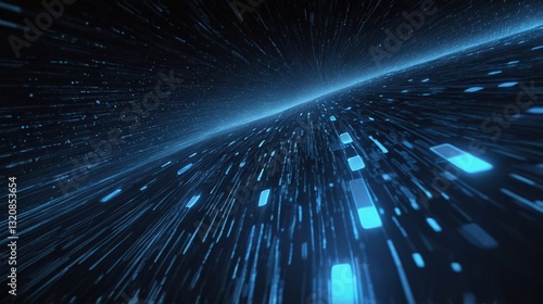 © Illustrations, Fototapeta premium A Breathtaking Journey Through A Digital Cosmos, Shimmering With Electric Blue Streaks Of Light And Data Flowing Across A Dark Expanse