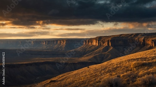 Naklejka premium A breathtaking landscape featuring dramatic cliffs and valleys under a moody sky at sunset.