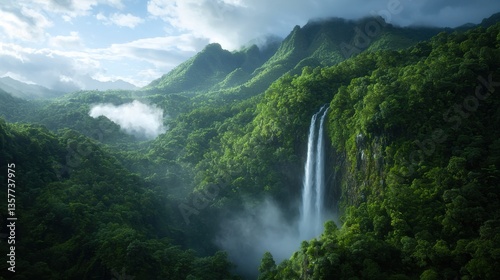Fototapeta premium A breathtaking landscape featuring lush greenery, a majestic waterfall, and...