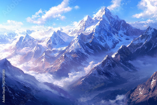 © Image Tree, Fototapeta premium A breathtaking landscape of sharp snowy mountain peaks against a vibrant sky.