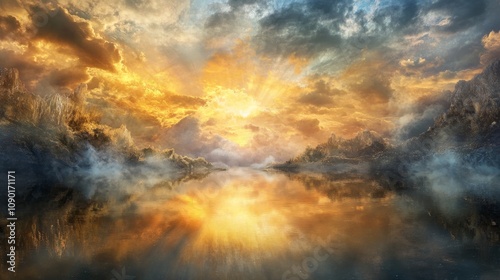 © SSP, Fototapeta premium A breathtaking landscape showcases a vibrant sunrise over a tranquil lake, with dramatic clouds and reflections creating a serene atmosphere.