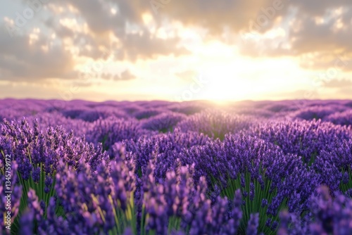 Naklejka premium A breathtaking lavender field in full bloom under a golden sunrise, bringing...