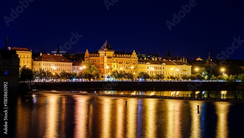 © Ilja, Naklejka premium A breathtaking long exposure photo of Prague, Czech Republic at night, showcasing the Vltava River, Prague Castle, and National Theatre, all under a clear, starry sky.