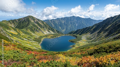 © JT Studio, Fototapeta premium A breathtaking mountain landscape featuring a serene lake surrounded by colorful foliage and dramatic peaks under a bright blue sky.