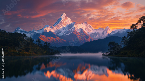 © Ejaz_Creates, Fototapeta premium A breathtaking mountain range at sunrise reflects in the lake, ideal for stock content about nature, travel or landscape photography
