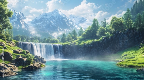 Fototapeta premium A breathtaking natural landscape, a cascading waterfall flows gracefully into a serene turquoise pool, with majestic snow-capped mountains in the background.