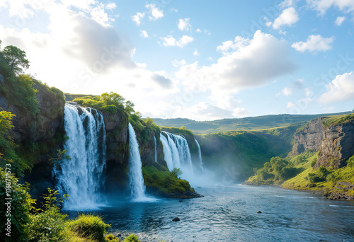 Fototapeta premium A breathtaking natural landscape of a cascading waterfall flowing down a...