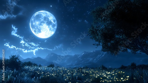 © Ben Kuang, Fototapeta premium A breathtaking night scene featuring a full moon illuminating wildflowers.