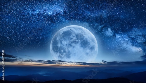 Fototapeta premium A breathtaking night sky showcases a luminous full moon surrounded by a starry backdrop, illuminating the dark silhouette of distant mountains.