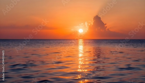 Naklejka premium A breathtaking ocean sunset with the sun low on the horizon, casting warm hues of orange and gold across the sky