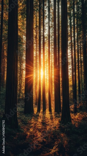 Fototapeta premium A breathtaking panorama of sunlight filtering through towering redwoods in a tranquil forest at dusk