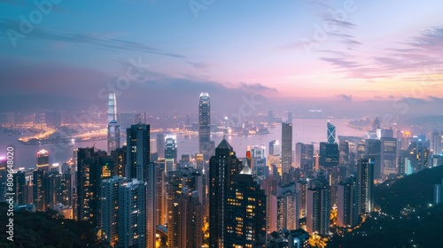 © venusvi, Fototapeta premium A breathtaking panoramic view of a serene cityscape at twilight, with towering skyscrapers illuminated against a soft, pastel sky.