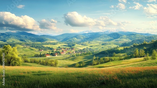 Fototapeta premium A breathtaking panoramic view of green hills and distant mountains under a...