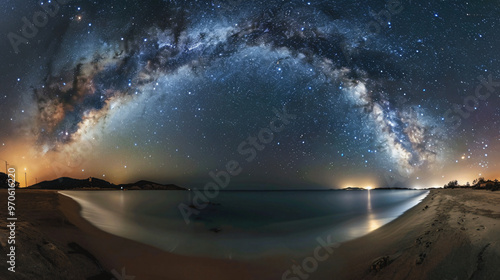 © Yuki, Fototapeta premium A breathtaking panoramic view of the Milky Way arching over a serene beach at night, with stars reflecting on the calm water, creating a magical atmosphere.