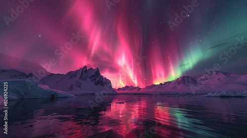 Naklejka premium A breathtaking picture of the Northern Lights illuminating the night sky with vibrant hues of green, pink, and purple, over a serene Arctic landscape.