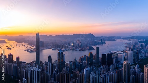 Obraz premium A breathtaking skyline view of Hong Kong during sunset showcasing city lights...